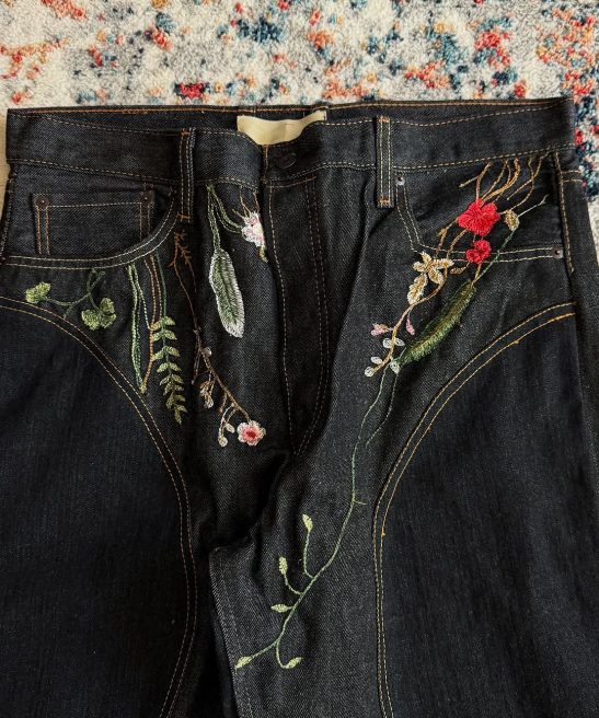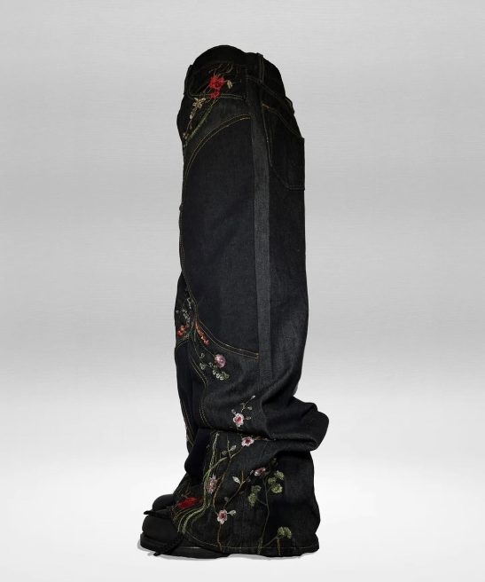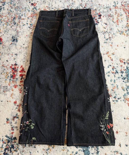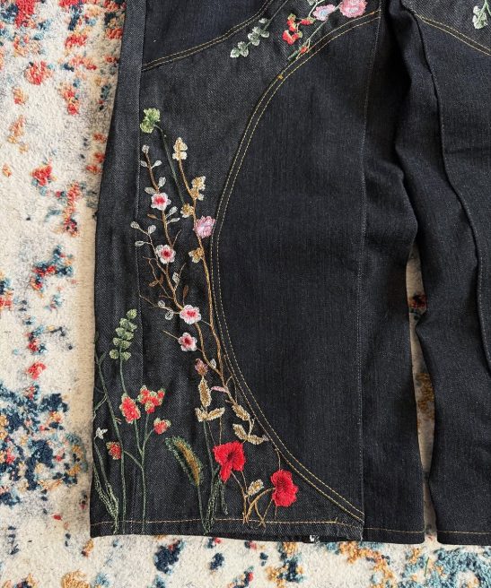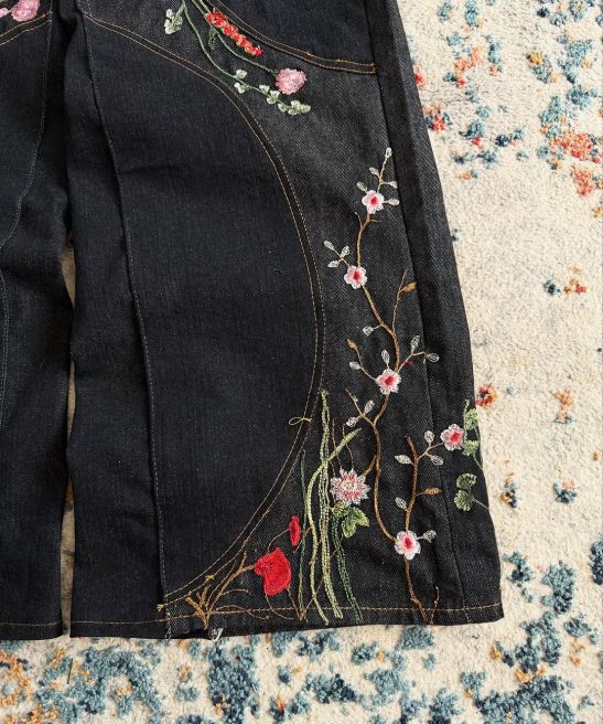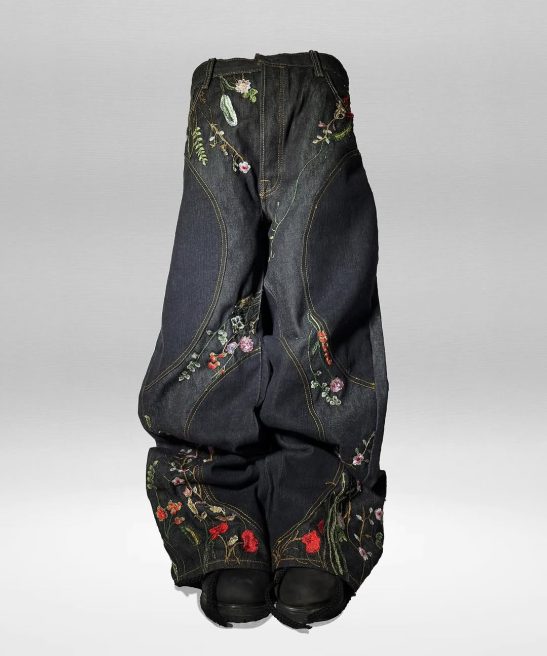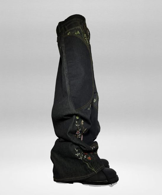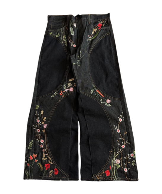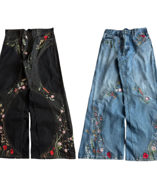 “FLORAL” blends the beauty of nature with streetwear vibes. Featuring 800.000 embroidered stitches depicting a floral paradise. a baggy wide-leg cut for effortless cool. and distressed details with custom leather tags. these jeans let you channel your inner urban nature guardian—where street style meets eco-conscious freedom.