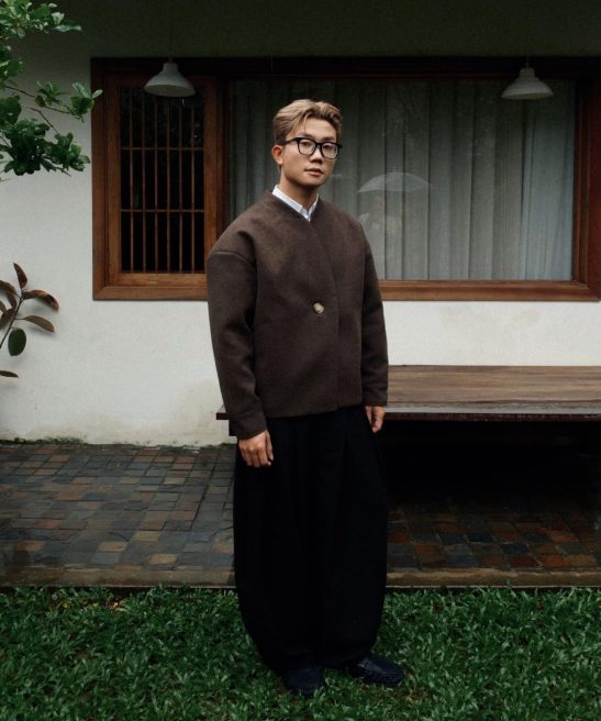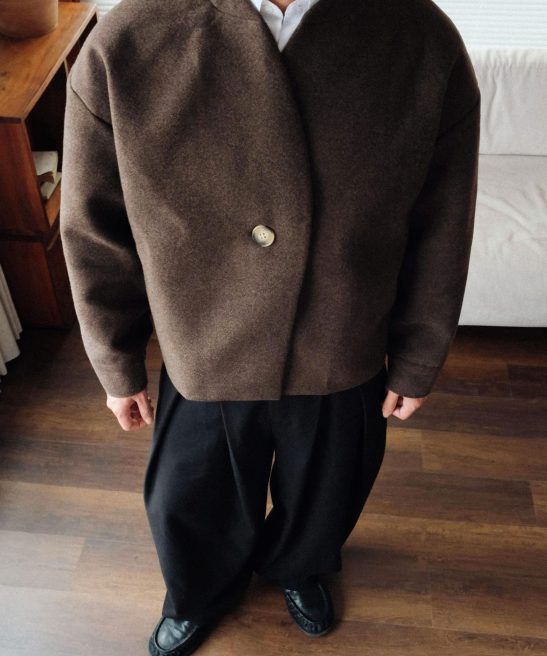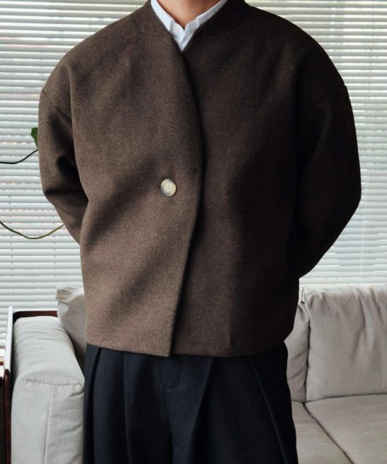 A structured take on minimalist outerwear. Crafted from a rich. heavy wool blend. Collarless neckline offers a clean. versatile look. Asymmetrical button closure adds a modern detail. The cropped. boxy fit is perfect for layering.